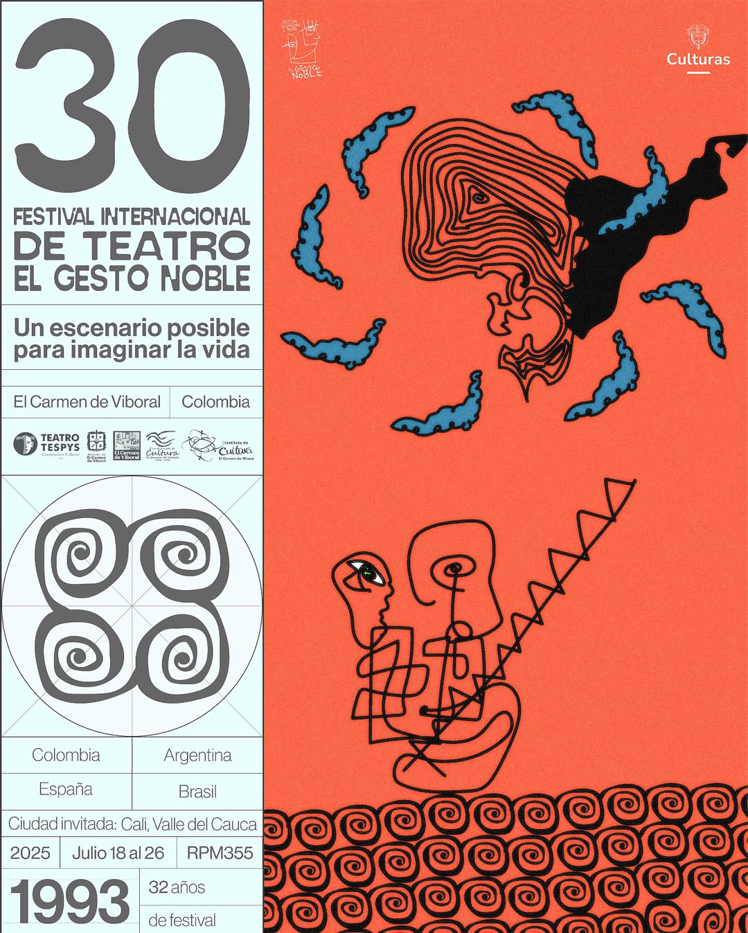 El Festival Internacional de Teatro El Gesto Noble 2025 se realiza en El Carmen de Viboral, consolidándose como uno de los encuentros culturales más importantes de Colombia. En su versión número 30, el festival cuenta con la ciudad invitada Santiago de Cali y la participación de más de 78 grupos artísticos, provenientes de diferentes regiones y países.